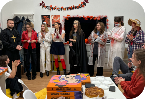 Играем в настолки, проводим корпоративы зимой и летом, празднуем день рождения каждого сотрудника.